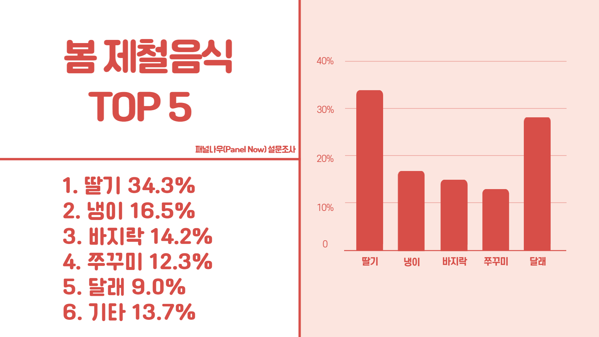 아직 아침 저녁으로는 찬공기에 손발이 시렵지만 낮에는 제법 따스한 봄기운이 올라오는 요즘입니다. 입춘이 얼마 남지 않았는데요, 오늘은 따스한 봄에 어울리는 제철음식 5가지를 소개하겠습니다. 아래는 설문조사 전문업체 패널나우에서 성인남녀를 대상으로 한 봄 제철음식 순위입니다.