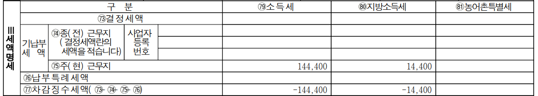 위는 실제 근로소득 원천징수영수증의 모습입니다. 첫 장 아래에 세액명세가 있고 결정세액에서 기납부세액을 차감하여 차감징수세액이 나오는 것을 볼 수 있습니다. 위처럼 마이너스 금액이 나오면 근로자가 세금을 환급받을 수 있게 됩니다.