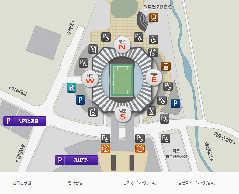 서울 상암월드컵경기장 주차장은 동쪽,서쪽 출입구 주차장, 바로 근처 평화공원, 난지천공원 주차장 총 4곳을 기본적으로 많이 이용합니다.
