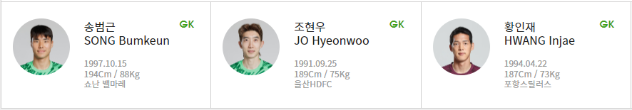 골키퍼에선 이창근 선수가 빠지고 황인재 선수가 합류하였습니다.